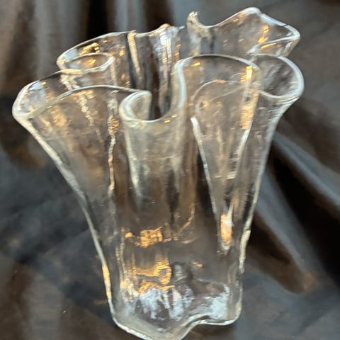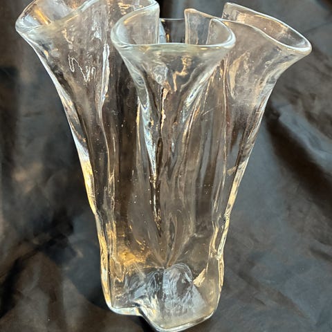 Pertti Kallioisen Muurlalle suunnittelema Eva-maljakko, joka on valmistettu kirkkaasta, aaltoilevasta lasista.