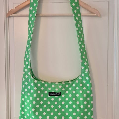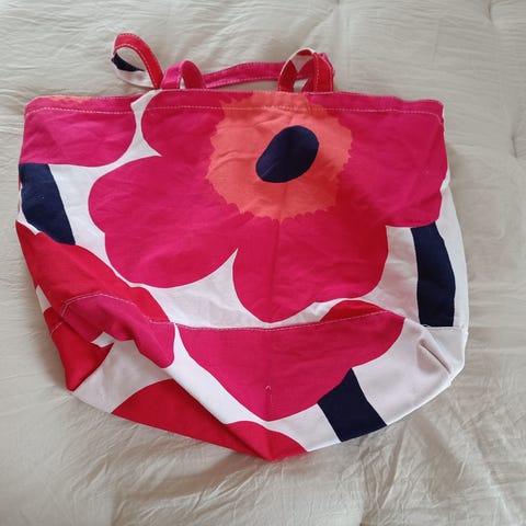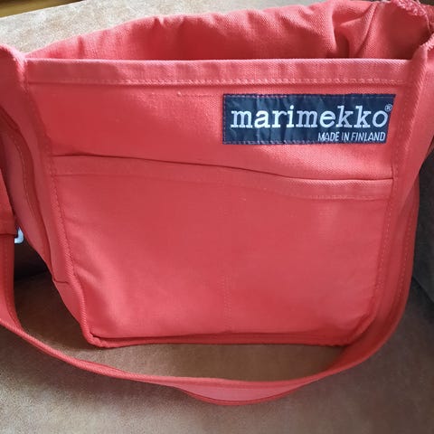 Marimekko retro kangaskassi / olkalaukku. Kassi on paksua puuvillaa, appelsiini kuosi. Kassissa on olkahihna ja magneettikiinnitys yläreunassa.