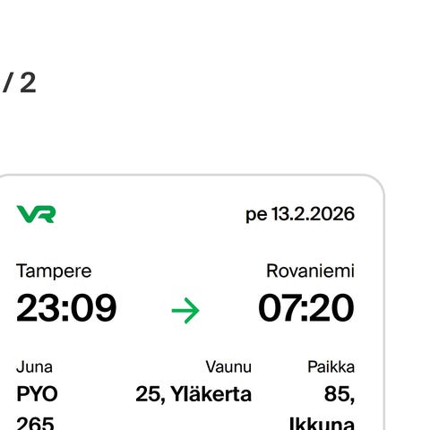 VR yöjunamatkalippu reitille Riihimäki–Kemijärvi aikuiselle matkustajalle. Lipussa on varaus vaunuun 23, alakertaan, lähellä ravintolavaunua sekä suksien ja laukkujen säilöntäpaikkaa. Itse maksoin hieman yli 90e tästä.