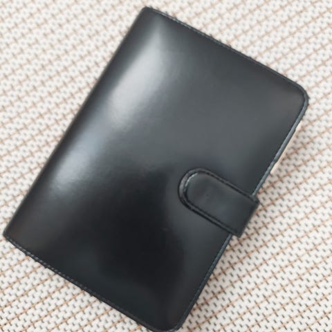 Minikokoinen järjestelmä. Kansissa vetoketjullinen lompakko, jossa vetoketjullinen kolikkotasku. Mukana viivain, aakkostetut ja numeroidut muoviset välilehdet sekä täydennyspaketti (muistiinpanosivut). Kannen koko 85 x 120 mm.