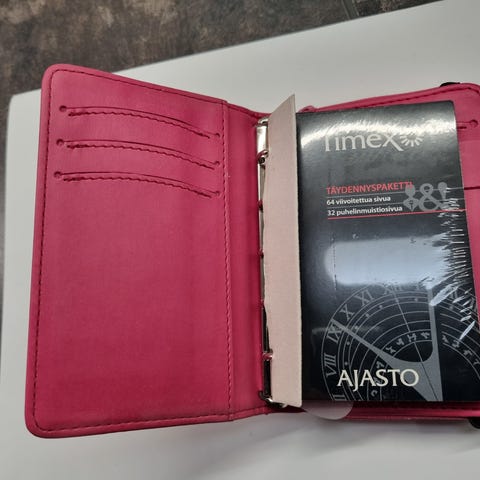 Kansissa kynänpidike, luottokorttiloveukset, säilytystaskuja sekä vetoketjullinen tasku. Pienikokoinen ja kätevä, toimii myös lompakkona.