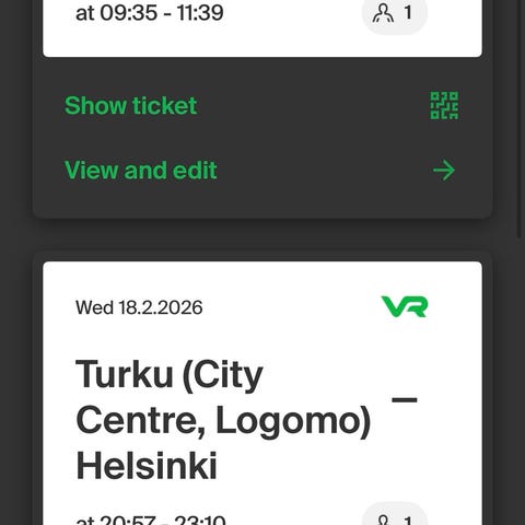 VR junalippu / junaliput reitille Turku – Helsinki. Lähtöaika Turusta klo 15:34 ja saapumisaika Helsinkiin 17:40. Vierekkäiset paikat. Myydään yhdessä tai erikseen: 2lippua 16e, yksittäin 10e/kpl. Mobilepay.