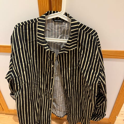 Kauluksessa jonkin verran kuluneisuutta ja kahden alimman napin kohdalla repeämät, jotka vaativat korjausta. Piiloutuvat kuitenkin paidan kiinni ollessa. Kai-kai 67 cm.
