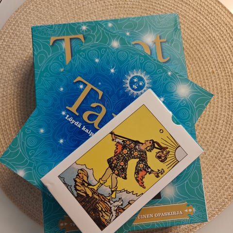 Kestävässä laatikossa jonkun verran käytetyt tarot-kortit sekä vihkonen (jota ei ole luettu juuri lainkaan).