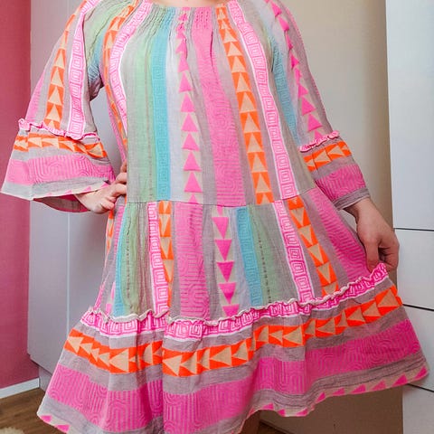 Myynnissä ihanan pirteä hempeän sateenkaarenvärinen mekko. Levenee alaspäin, joten mahtuu monenkokoiselle ja on rento yllä. Kokomerkintä S, mutta on isoa kokoa, kuvassa L-kokoisella ja on täysin sopiva. Kai-kai 56cm. Materiaali puuvillaa, merkki Reserved, kunto erinomainen. Voi käyttää myös offshoulder-mallisesti kuminauhan ansiosta.