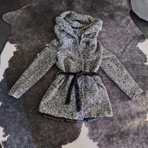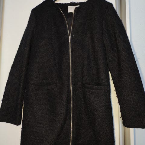 Vila villakangastakki naisille. Koko S. Väri musta. Siisti kunto, koska käytetty vain pari kertaa. Materiaalina villasekoite, vuorillinen. Takissa on puolipitkä malli ja vetoketjukiinnitys edessä. Kaksi taskua edessä. Hupullinen kaulus ja muotoillut leikkaukset tuovat istuvuutta.
