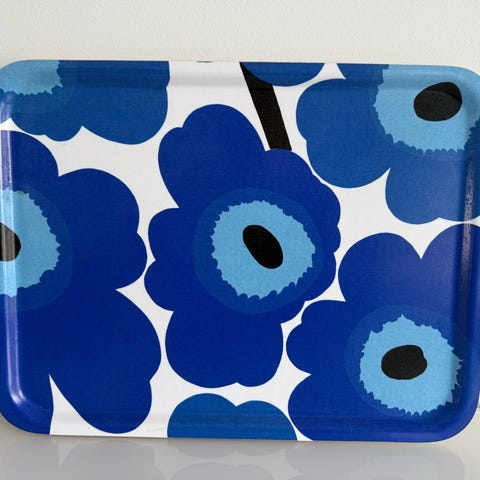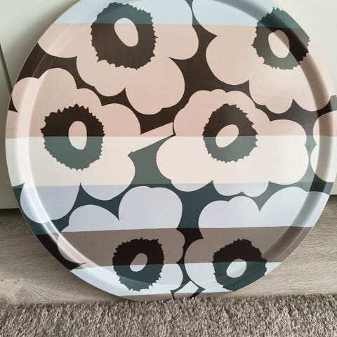 Marimekon puinen Unikko Ralli tarjotin 46 cm. Hyväkuntoinen, ei paljon käytetty. Pinnoitteessa jo uutena pieniä rantuja, ks. kuva.