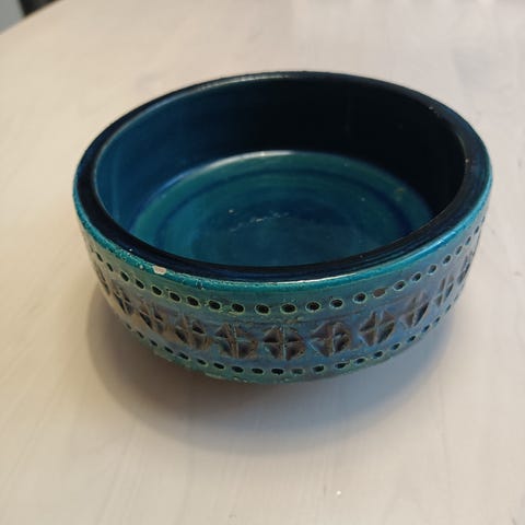 1960-luvulla Riministä matkamuistona tuotu pieni maljakko, Bitossin Rimini Blue -sarjaa, suunnittelija Aldo Londi.