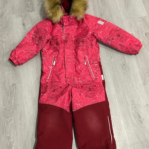 Vähäisellä käytöllä ollut Reiman talvihaalari, koko 110. Huppu irrotettava ja sisäpuolella kuminauhalla kiristettävissä vyötäröstä.