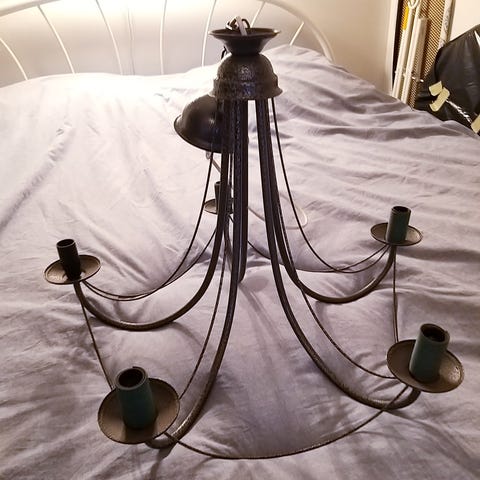 Näyttävä kattokruunu. Kaunis monivärisesti hohtava pinta ja koristeelliset riipukset tuovat huoneeseen eleganttia ilmettä. Sopii hyvin esimerkiksi olohuoneeseen, makuuhuoneeseen tai juhlavampaan tilaan. Ollut meillä käytössä noin viitisen vuotta. Normaalia pientä käytönjälkeä. Mukana viisi E14-kantaista polttimoa, josta yksi ei toimi. Myyn nopeimmalle, ei tinkimisvaraa.