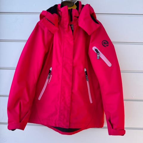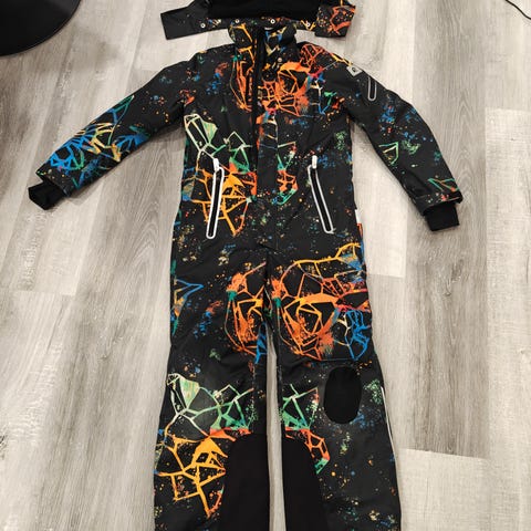 Reima ulkoiluasu, johon kuuluu takki ja henkselihousut. Koko 134 cm, unisex-malli. Väri oranssi. Materiaali polyesteriä.