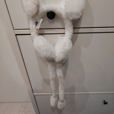 Luonnonvalkoiset lämpimät pupunkorvamalliset korvanlämmittimet. Riippuvista osista painettaessa korvat nousevat pystyyn