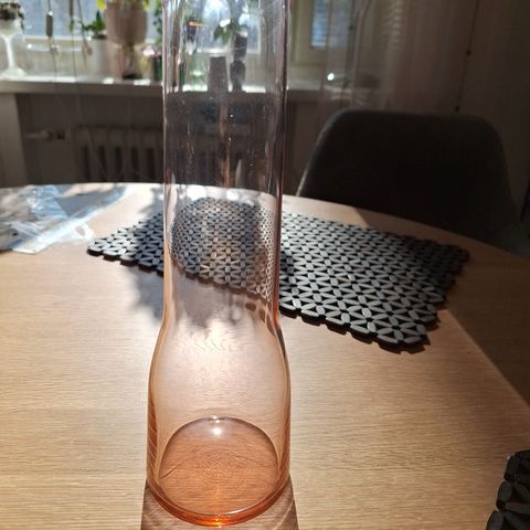 Iittala lasikannu Essence, lohenpunainen. Käytetty maljakkona. Sameutta lasissa. Ehkä lk 2.