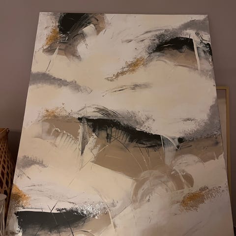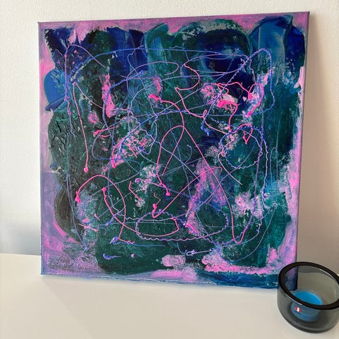 Abstrakti maalaus akryyliväreillä kankaalle. Teoksessa on orgaanisia, kaarevia muotoja ja värisävyinä vaaleaa beigeä, ruskeaa, mustaa, valkoista sekä vaaleanpunaisia ja violetteja korostuksia. Pinta on elävä ja kerroksellinen, ja maalauksessa on pieniä piste- ja roiske-efektejä. Sopii sisustuselementiksi esimerkiksi olohuoneeseen, makuuhuoneeseen tai työtilaan. Maalaus on toteutettu yhdelle kankaalle, joka voidaan ripustaa seinälle.