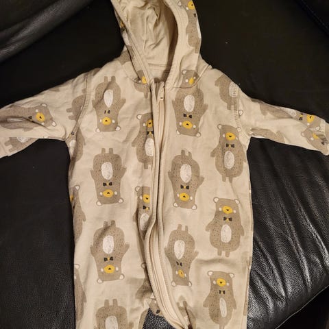Collegehaalari, jossa on tasaisen vaaleanpunaisia ja pupukuvioisia kohtia. Valkoiset resorit kauluksessa ja hihan- ja lahkeensuissa. Nepparikiinnitys yläselässä ja haaroissa.
