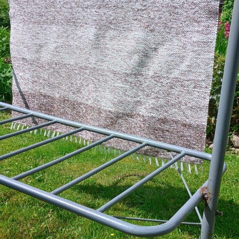 Rustasta ostettu matto. Pidetty lastenhuoneessa. Päällisin puolin oikein siistikuntoinen, mutta lähempää tarkasteltuna voi olla joitakin pieniä tahroja, jotka varmasti puhdistamalla lähtevät. Nukka luonnollisesti painunut käytön myötä.