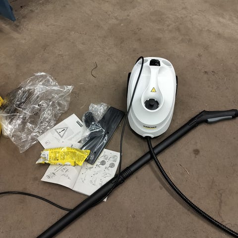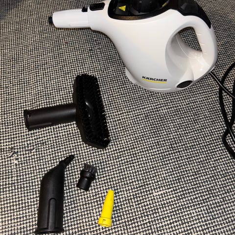 Kärcher SC 5 EasyFix Premium höyrypuhdistin kotitalouskäyttöön. Laite on pyörillä liikuteltava höyrypuhdistin, jossa on irrotettava vesisäiliö ja säädettävä höyryn määrän säätö. Mukana tulee useita lisävarusteita, kuten lattiasuulake, jatkovarsia, pienempiä suulakkeita sekä mikrokuituliinoja ja -päällisiä eri pinnoille. Puhdistin soveltuu koville lattioille, laatoille, saumoille ja muille vesipestäville pinnoille. Mukana myös käyttöohjeita ja ostokuitti, josta ilmenee mallin tarkempi nimi ja alkuperäinen ostopaikka.