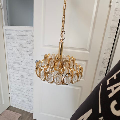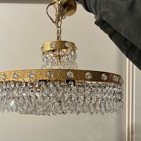 Valaisimessa on kullattu messinkirunko ja 5kpl valopisteitä. Yksi kristalli puuttuu ja se on huomioitu hinnassa.