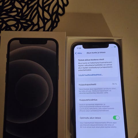Apple iPhone 12 mini, tallennustila 64 GB. Värinä sininen. Laitteessa on muutamia pieniä kolhuja, joista väriä lähtenyt. Takakameran toisessa linssissä särö. Akun kapasiteetti on 71%. Ostettu v. 2022. Hyvä ja toimiva puhelin kun vaihtaa akun ja korjauttaa linssin. Käytössä ollut alkuvuoteen asti. Mukana ei ole laturia. Mukaan tulee alkuperäinen laatikko. Vain nouto ja maksu ainoastaan mobilepay. Ei käteistä.