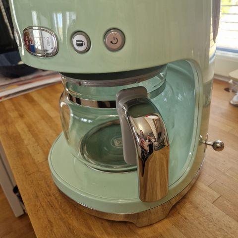 Smeg kahvinkeitin mintunvihreä. Suodatinkahvinkeitin, jossa lasikannu ja vesimäärän näyttö laitteen sivussa. Yläosa avattavissa suodatinpidikkeen ja kahvijauhesäiliön täyttöä ja puhdistusta varten. Soveltuu tavallisen suodatinkahvin valmistukseen kotikeittiössä.