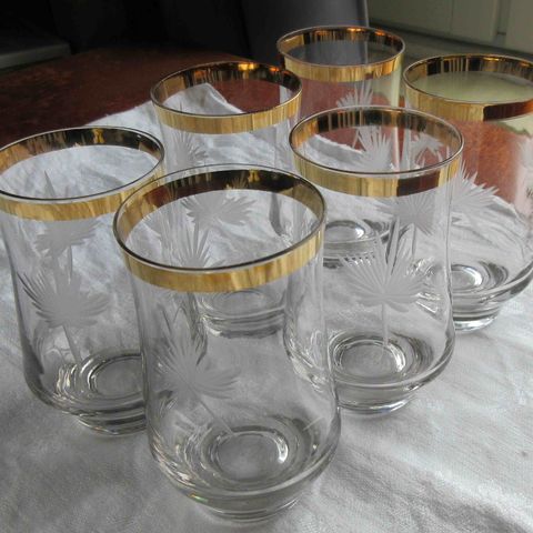 Kauniit peurakuvioiset juomalasit 6 kpl. Kulumaa kultauksessa. Hinta yhteensä 10e.