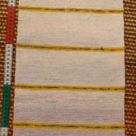 Siniraidallinen pussipoppana. Leveys 41 cm ja korkeus ilman hapsuja 58 cm. Sopii tyynynpäälliseksi tai voit tehdä siitä kassin. Hintapyyntö 3 euroa.
