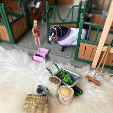 Myydään Schleich -talli ja tarvikkeita (sis. 1 hevonen ja 4 ukkoa). Tallin avattavasta katoksesta puuttuu yksi jalka, mutta kestää silti hyvin kasassa ja paikoillaan. Hieman kulumaa ja leikinjälkiä näkyvissä, mutta yleisilme siisti ja ehjä.