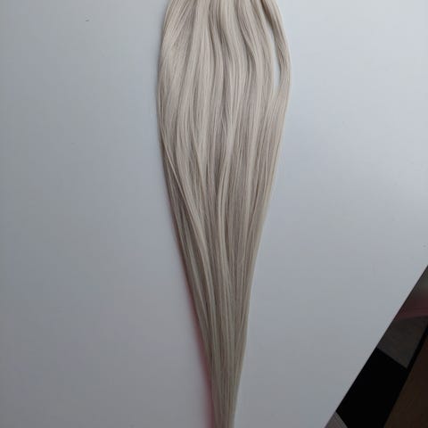 Uusi ja käyttämätön, kirkkaan vaaleaa. Siloitettua parempaa kuitua, joka kestää 100-150 asteen lämmön/käsittelyn. Luonnollisen hiuksen näköistä. Pituus 65-70cm. Hinta 30e sisältää postimaksun seurannalla