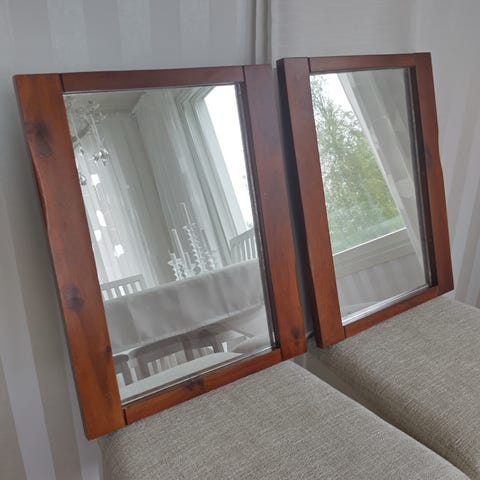 Myydään muuton vuoksi puinen peili ikkuna. Leveys 68cm, korkeus 68cm