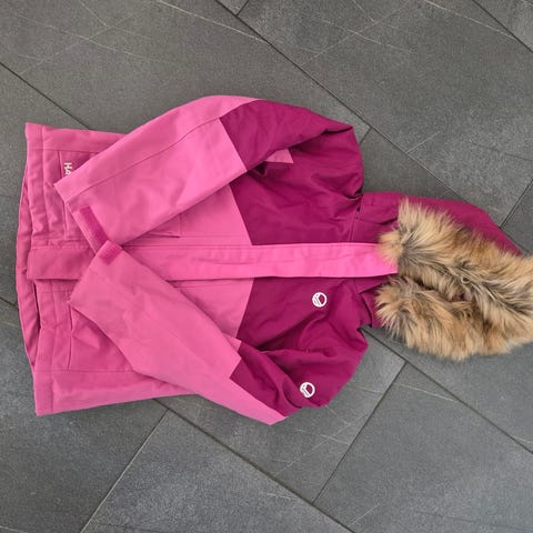 Yhdellä tytöllä ollut Haltin laskettelu/ulkoilutakki. Takki on juuri pesty. Toisessa kainalossa ja niskassa on hieman nukkaa (kuva).