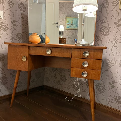 1950-luvun suomalainen kampauspöytä. Teakia. Taso on kulunut/kuivunut ajan saatossa mutta hiomalla ja uudella lakalla varmasti "salonkikelpoisen" siitä saa. Pöydän peilit on täysin uusittu. Peiliosuus on irrotettavissa.