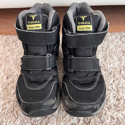 Kengät ovat mustat vaaleanpunaisilla yksityiskohdilla ja harmaalla pohjalla. Varressa on tarrakiinnitys ja edessä joustonauhat, jotka helpottavat pukemista. Kengissä on korkea varsi ja kuvioitu ulkopohja, joka antaa pitoa liukkaalla alustalla. Sopivat sekä tytöille että pojille talvi- ja välikausikäyttöön.