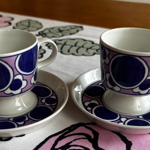 Kahvikupit ovat olleet lähinnä koristekäytössä. Kupin korkeus 6,5 cm ja halkaisija samoin 6,5 cm. Lautasen halkaisija 12 cm. Sarjan on suunnitellut Kaj Fank.