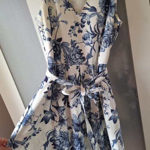 Klassinen A-linjainen leikkaus, joka korostaa vyötäröä ja luo kauniin, imartelevan siluetin. Syvänmustalla pohjalla hehkuvat suuret punaiset ja valkoiset ruusut, joissa on ripaus sinisiä lehtiä.