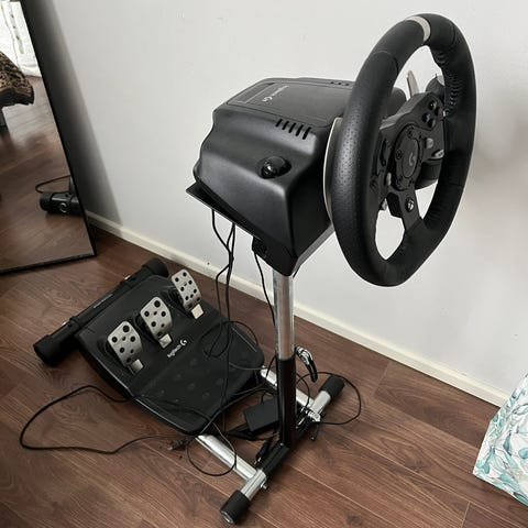 Logitech G920 -peliohjainratti polkimilla. Pakettiin kuuluu rattiohjain ja erillinen poljinsetti (kaasu, jarru ja kytkin). Ratti on suunniteltu yhteensopivaksi Xbox-konsolien ja PC:n kanssa.