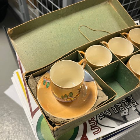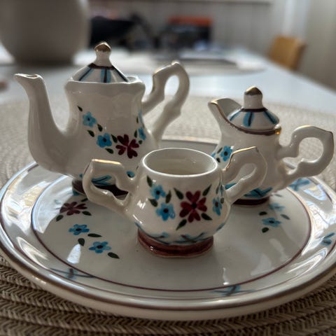 Ihastuttava lasten leikkeihin tarkoitettu posliininen kahviastiasto.