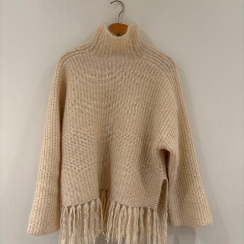 Tyylikäs poolokauluksellinen neule paksua ja tiheää neulosta. Materiaali viskoosi ja nylon. Leveät hihat jotka tiukentuvat ranteesta, eli huhat eivät sotkeennu helposti. Hyvä yleiskunto. Edessä pieni kuluma josta lähikuva. Ei ole käytetty paljoa. Kuvassa L-kokoisella, aika lyhyt malli joka sopii mielestäni M-L koolle.