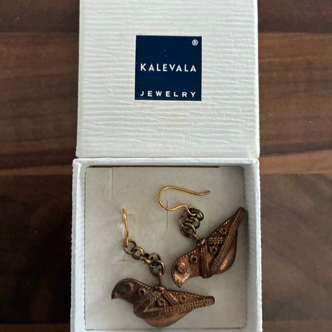 Käytössä olleet Kalevalan pronssiset Hattulan lintu-korvakorut, joihin on vaihdettu koukut, jotka ovat kirkkaammat kuin lintu. Rasiaa ei ole. Pakettiautomaattilähetys Manner-Suomeen 6 euroa, josta saa lähetyksen seurantanumeron. Nouto Kuopiosta keskustasta. En käytä ToriDiiliä.