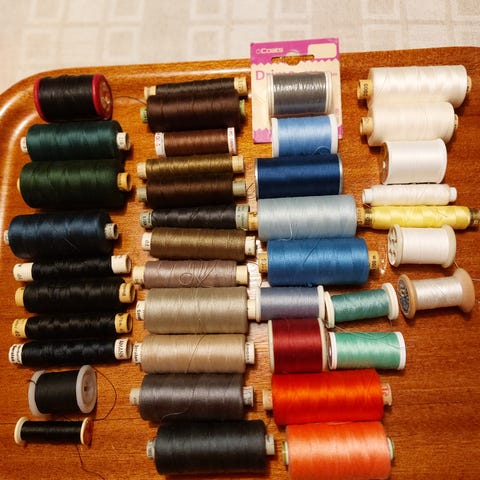 Vanhoja ompelulankoja. Suurimmasta osasta melko vähän käytetty. Myös muutama "uusi", avaamaton rulla.