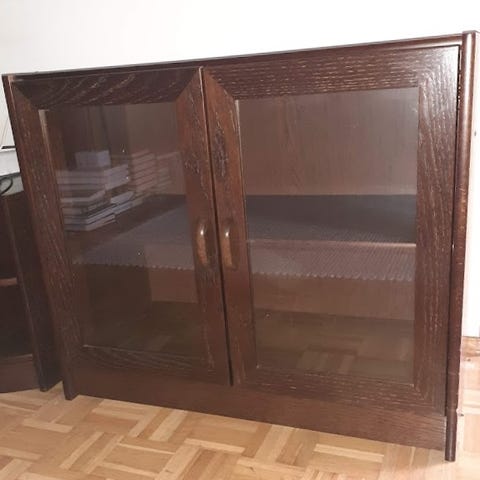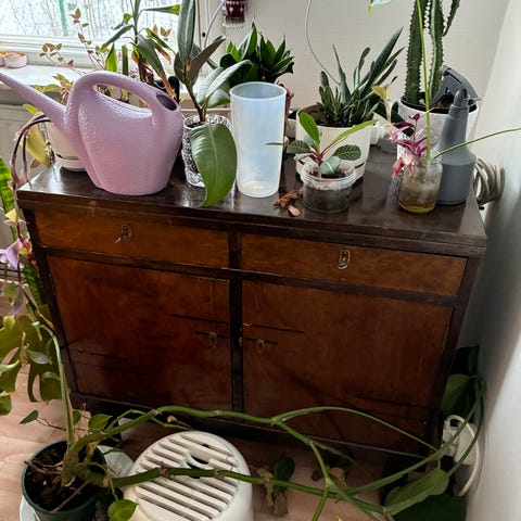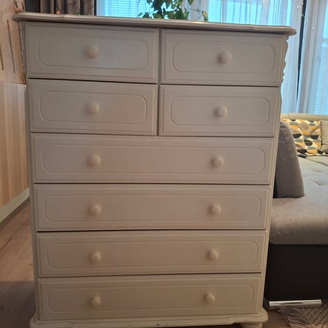 Uniikki tummanvihreä lipasto, kullanvärisillä yksityiskohdilla. Puun ja lastulevyn sekoitus. Tukeva ja laatikot hyvässä kunnossa. Pääliosassa kukkaruukusta jäänyt pyöreä "tahra". Kulumisen merkkejä löytyy kauttaaltaan, yleisilme edelleen siisti.