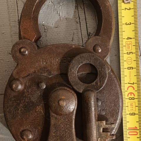 Harvinainen ja täysin toimiva antiikkinen kyläsepän takoma riippulukko. Upeasti patinoitunut antiikkiesine, jonka voi ottaa vaikka käyttöön :). Harvinainen myös siinä mielessä, että alkuperäinen avainkin on vielä tallella.