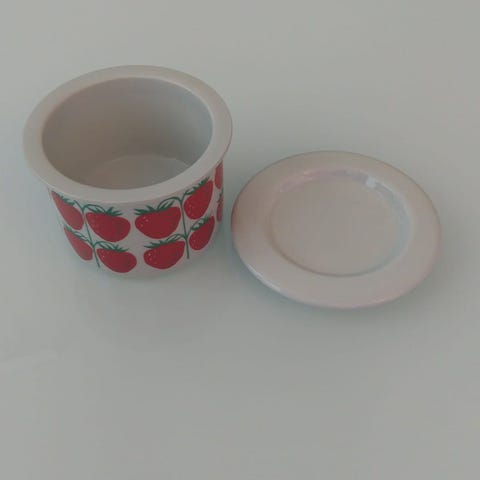 ARABIA Pomona kannellinen kippo, korkeus 6 cm. Virheetön. Vain nouto Etelä-Espoosta tai Helsingin keskustasta.