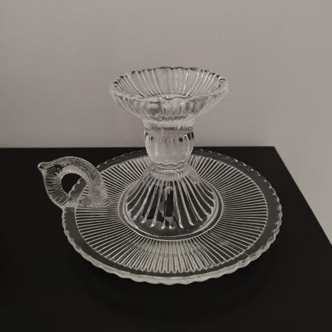 Myydään vanha lasinen kynttilänjalka. Ehjä ja hyväkuntoinen. Vain nouto.