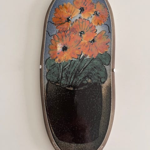 Myydään kaunis Heljä Liukko-Sundström -suunnittelema Arabian keraaminen seinätaulu “Sateenvarjokukat” (vuosi 1991). Ajaton kukka-aiheinen design-taulu.