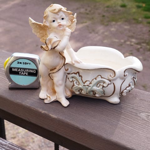 Kultahippuja sisältävä pallo, missä enkeli soittaa soitinta. Korkeus n.7cm ja halkaisija n.8cm. Hintaan lisätään postikulut tai nouto Merikarvialta.