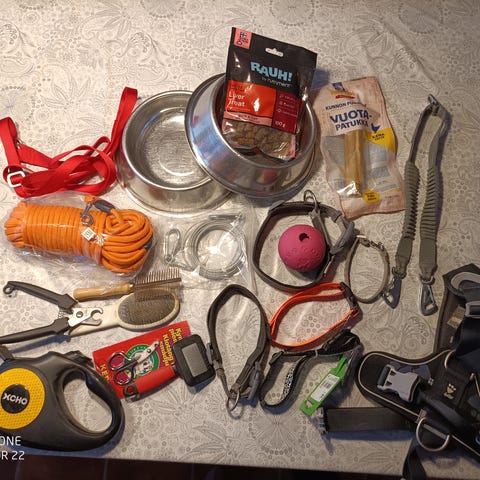 Nyt todellinen "puuhapaketti" koiralle. Sisältää paljon varusteita ja välttämättömiä tarvikkeita koiran pitämiseen ja hoitoon.