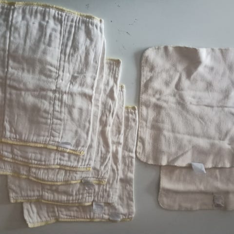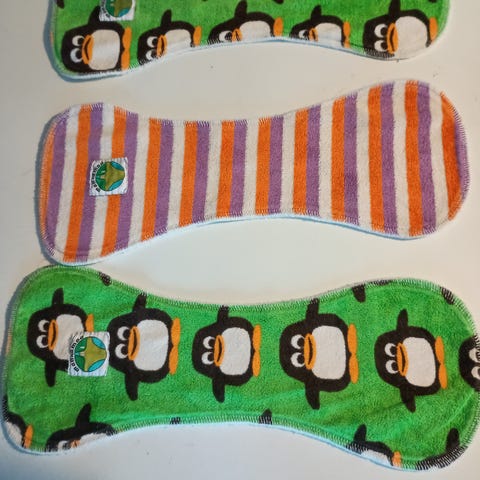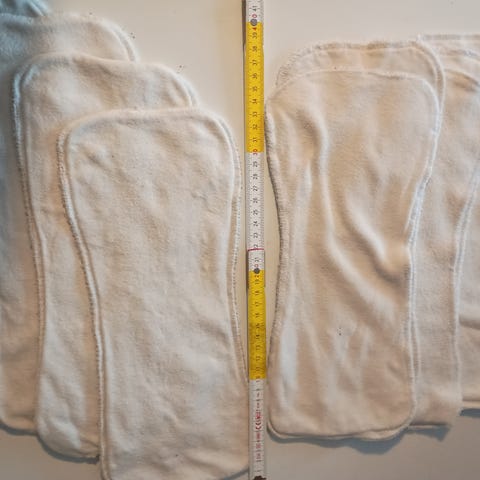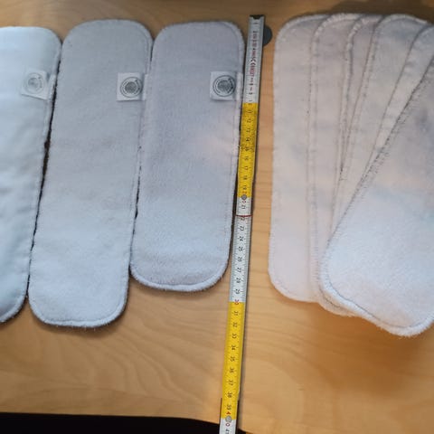 Imut kestovaippaan. Tarvitsevat jotain muutakin imua lisäksi, vaikka ovatkin aika paksut ja hyvin imevät. Sopivat ainakin M kokoon, myös isompiin S kokoisiin. Pituudet vaihtelevat 29-31 cm. Leveydet 9-10 cm. Siistit. Jonkun verran kulumaa osassa. Ei häiritseviä tahroja. Materiaalina on ainakin bambua, pinta vaikuttaa puuvillalta. En tiedä tarkemmin.