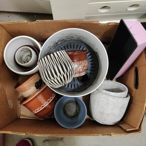 Kaikenkokosii ja värisii kukkaruukkuja mitä nyt on kasviharrastuksen myötä kertyny nurkkiin. On isompaa amppelityylistä (ei koukkua) ja pienii taimiruukkuja sekä orkidearuukkuja, sekä parit tuunatut taleaway astiat joissa siememet lähteneet hyvin alkuun.
