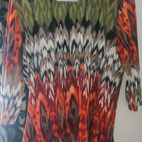 Beige, hienoisesti ribbimäinen puuvillakangas. Väljä malli, jossa pudotetut olkasaumat, vajaamittaiset hihat ja korkea kaulus. Helmassa kiristysnyöri istuvuuden säätöön.