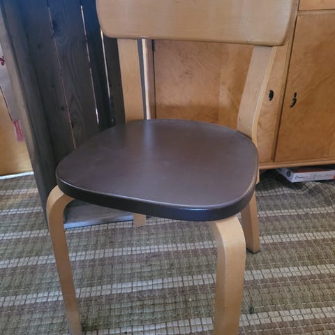 Alunperin koivuviilutettu, entisöity IKI-laminaattipinnalla molemmin puolin jotta pysyy varmasti suorana. Samalla hiottu ja pintakäsitelty uudestaan. Entisöijän nimi ja vuosiluku voidaan laseroida piiloon tarvittaessa.